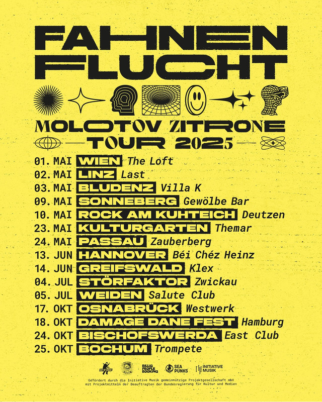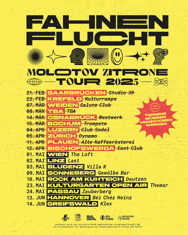 MOLOTOV ZITRONE TOUR. Die zweite Rutsche der Tour steht. Die ausfallenden Termine können wird zum Teil noch dieses Jahr nachholen. Der Rest wir dann leider erst 2026 möglich sein. Gerne hätten wir die Termine zusammenhängend gespielt. Jetzt ist die zweite Jahreshälfte etwas gestückelt.