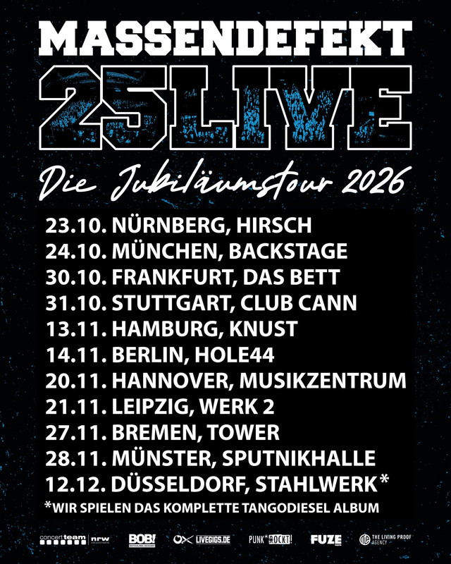 2026 feiern wir unser Jubiläum dort, wo wir uns am wohlsten fühlen: auf der Bühne. Mit der ,,25 LIVE"-Tour gehen wir ab Oktober auf Reisen und spielen elf ausgewählte Shows quer durch Deutschland. Wir bringen Songs aus allen Phasen zusammen und schauen dabei zurück und nach vorne zugleich.